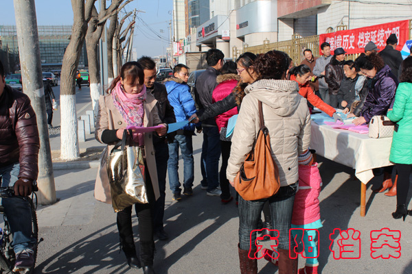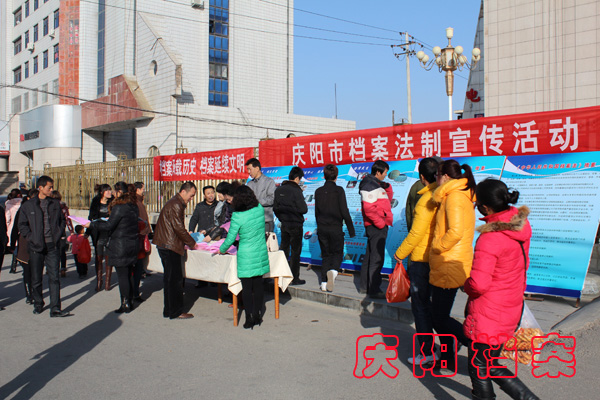 为纪念《档案法》颁布25周年,进一步增强社会档案意识和档案法制观念,全面推进依法治档,优化档案事业发展环境, 11月29日市档案局在庆阳剧院门前开展了档案法制宣传咨询活动。通过档案宣传展板、播放《档案法》录音,发放宣传资料、悬挂宣传横幅、便民咨询服务等形式,面向社会广泛宣传档案法律法规。工作人员有的向过往群众发放宣传资料,有的向前来咨询的群众进行热情耐心的解答。宣传现场人头攒动,气氛热烈。
